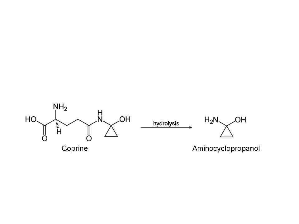 Coprinopsis atramentarius contains the mycotoxin coprine, which is a non-proteinogenic amino acid, like hypoglycin of the ackee. But coprine isn’t the exact poison. It’s what I’ve termed a propoison – a chemical that is converted to its active poisonous form through a normal metabolic process, like hydrolysis. [This is my spin-off of a prodrug, which is common in the pharmaceutical world.] In the body, coprine is hydrolyzed into the amino acid glutamic acid and the poison 1-aminocyclopropanol: