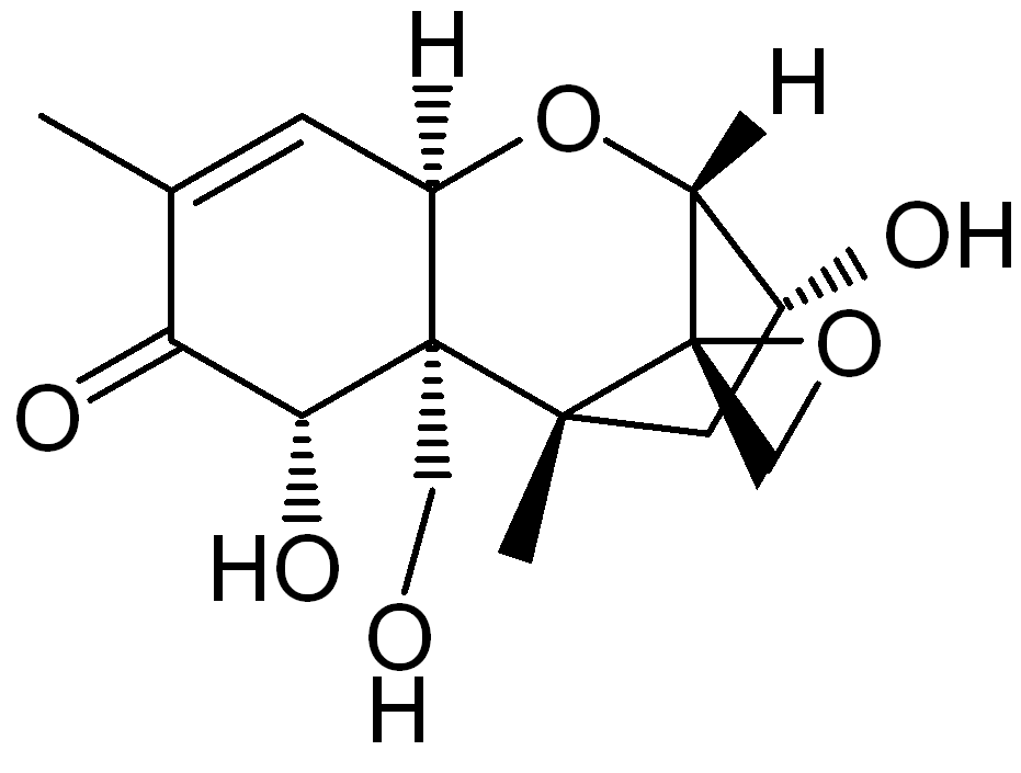 So just what is shitoxin…I mean vomitoxin? Vomitoxin, also known by the lame name deoxynivalenol, belongs to a family of mycotoxins (fungus derived toxins) called trichothecenes. The trichothecenes share the tricyclic backbone exemplified by vomitoxin on the left. Many of these mycotoxins are produced by the fungal genus Fusarium.