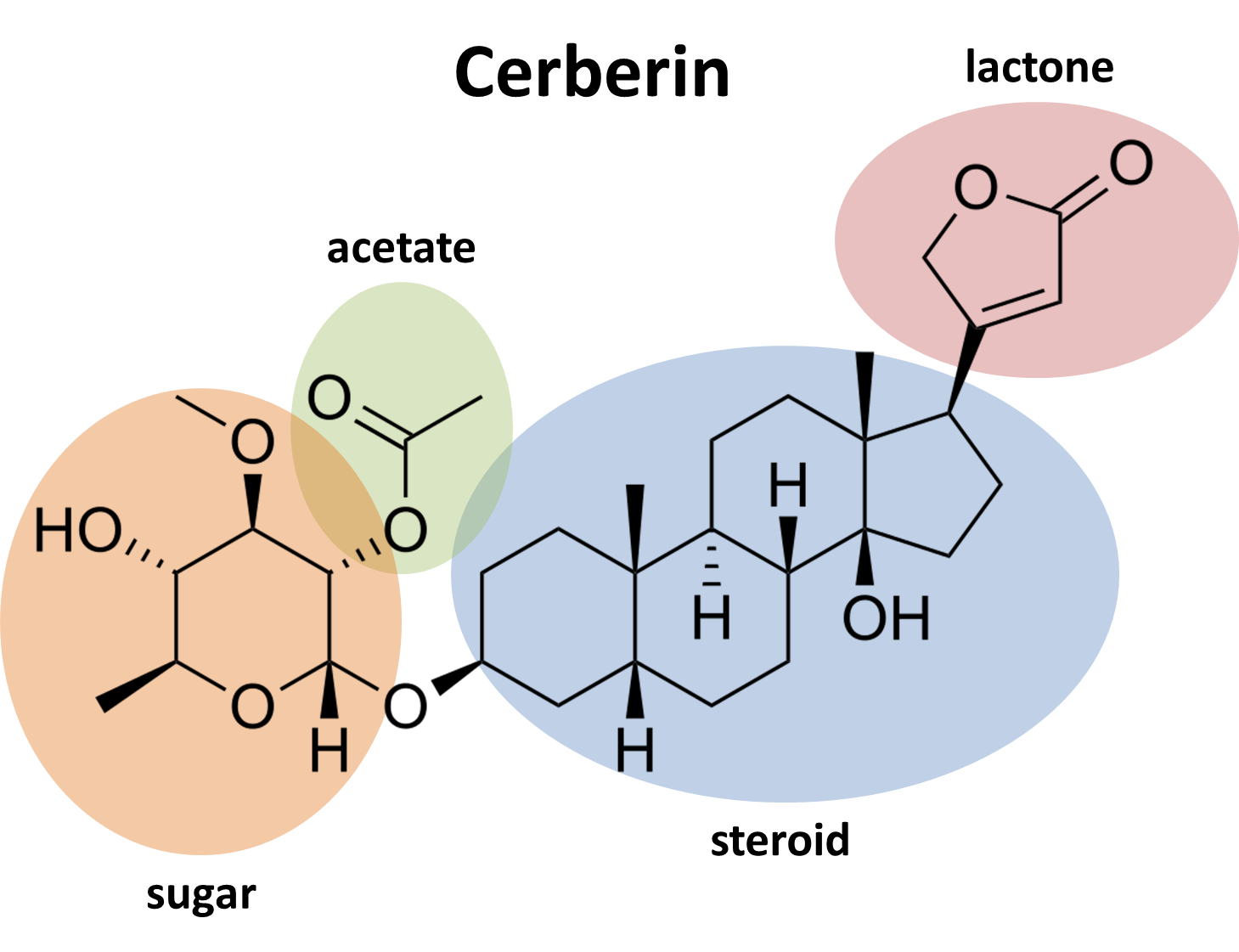 The Cerbera kernel contains several glycosides, with the most notable being cerberin. Take a look at the structure of cerberin, then take a look at the structure of oleandrin, from Oleander. There’s no hurry, I’ll wait. Do they look similar? Damned near identical, huh? Both have a steroid nucleus with a lactone moiety, and conjugated to a sugar, with the only difference being the position of the acetate group. So no surprise when I tell you that the toxic effects of cerberin mirror those of oleandrin.