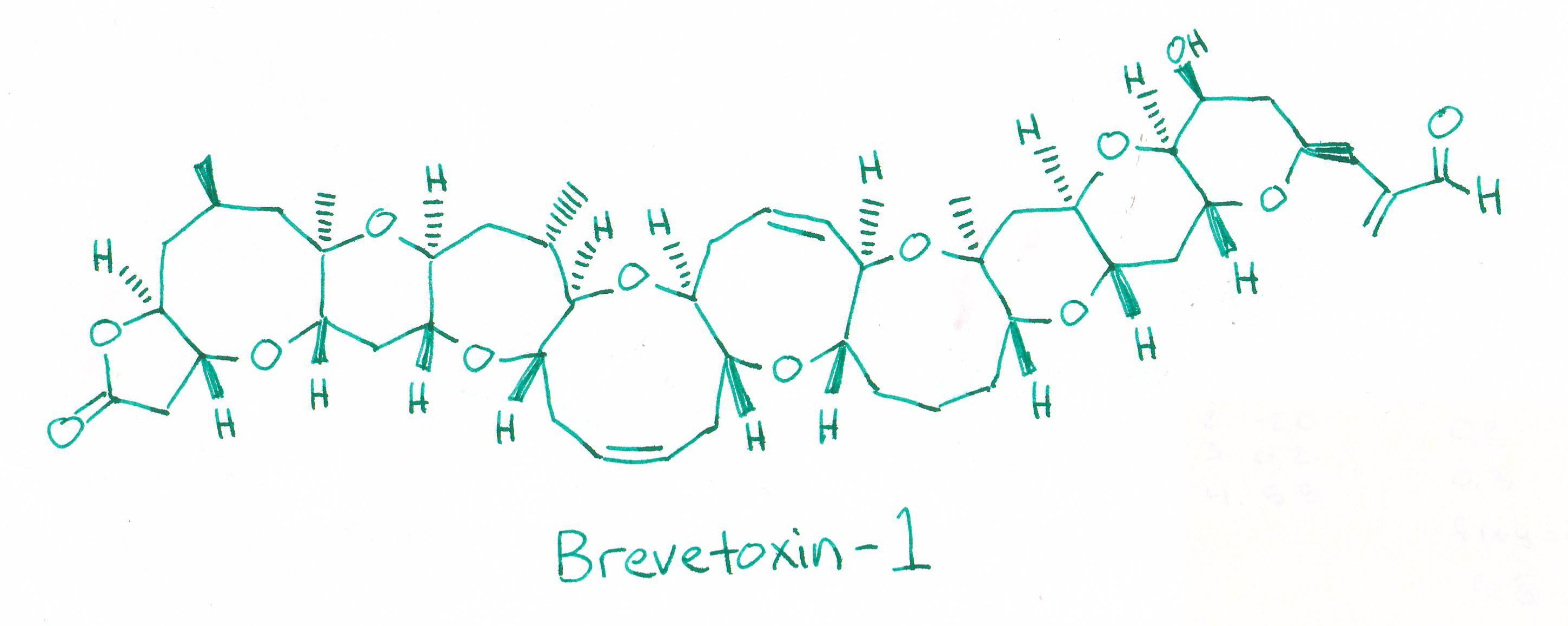 But ingestion is only a small part of the problem. Of particular risk to humans is the aerosolization of toxins. As K. brevis breaks up on the shore, its toxin is taken up by the salt air and winds, spreading it throughout. In this way, Mother Nature has weaponized a toxin in her arsenal and subjected it to unsuspecting humans. And the toxin? Brevetoxin.*