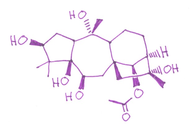 Astute readers are already well aware of grayanotoxins and their role in “mad honey,” honey made from the nectar of grayanotoxin-containing rhododendrons and azaleas. Ingestion of grayanotoxin-poisoned honey can bring about sweating, salivation, nausea, and in high doses, cardiac effects, but is rarely fatal in humans. Grayanotoxins, of which there are four related structures, vary in concentration depending upon the plant species and exert their toxicity by interfering with voltage-gated sodium channels, much like the Queen of Poisons, aconitine. Cell membranes sustain a  membrane potential – a voltage difference of about -70 millivolts between the inside and outside of the cell. This voltage difference can fluctuate when sodium and chloride ions flow into the cell and potassium ions flow out via, you guessed it, sodium channels. Excitable cells, like neurons and muscle, use these action potentials for transmitting electrical signals throughout the body. This is how we feel pain and make our muscles contract.